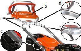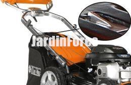 La descarga lateral se efectúa mediante la apertura del canal lateral y el montaje del deflector de hierba (suministrado de serie). En nuevo manillar ergonómico con articulación central, es regulable en cualquier altura para todos los usuarios además de poseer unas palancas para desenganchar, abatir y plegar totalmente el manillar para ocupar menos espacio de guardado.